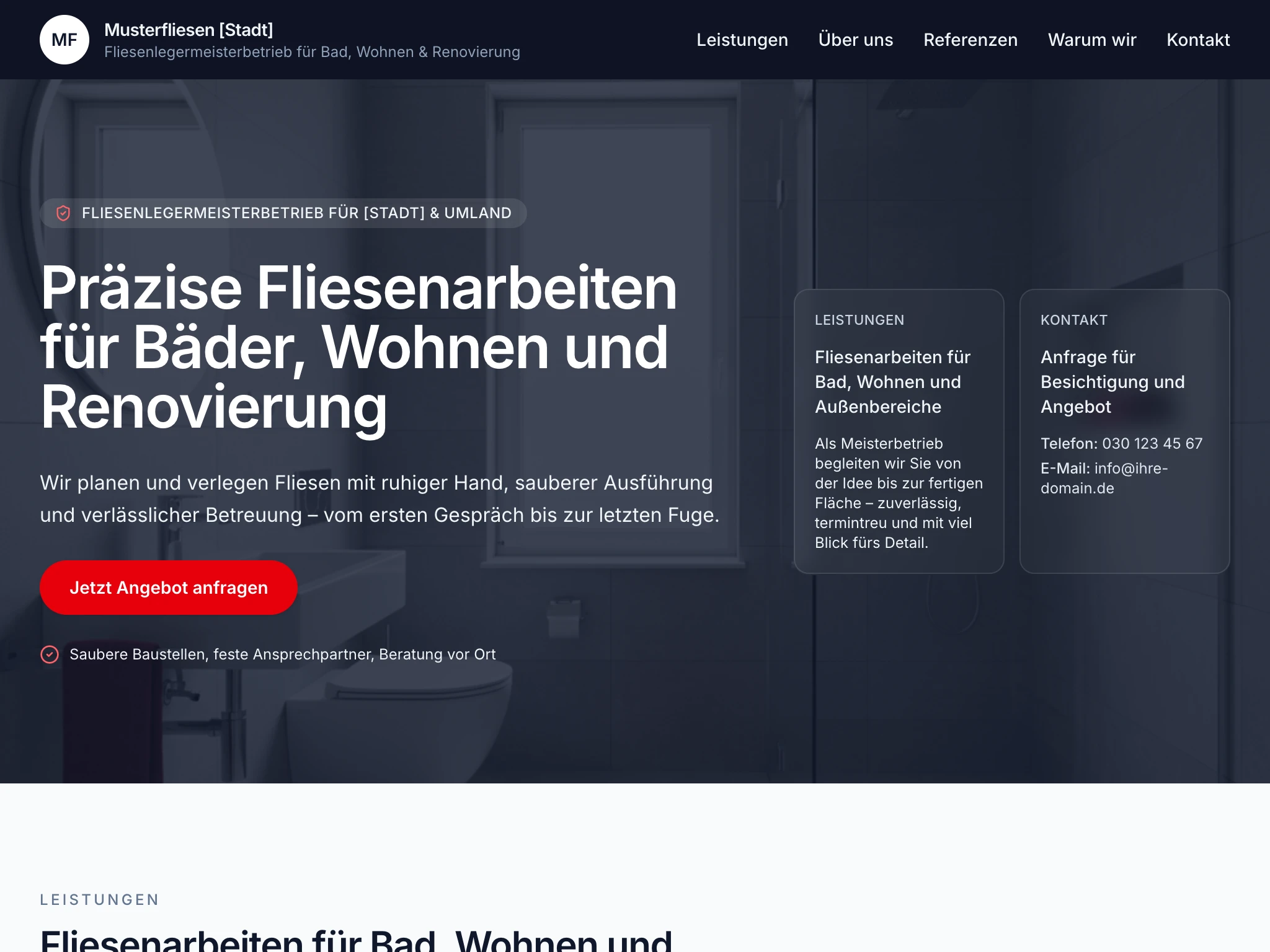 Präsentiere Bäder, Böden und Sanierungen so, dass aus Besuchen echte Anfragen werden, auch wenn Interessenten nur kurz am Handy schauen.